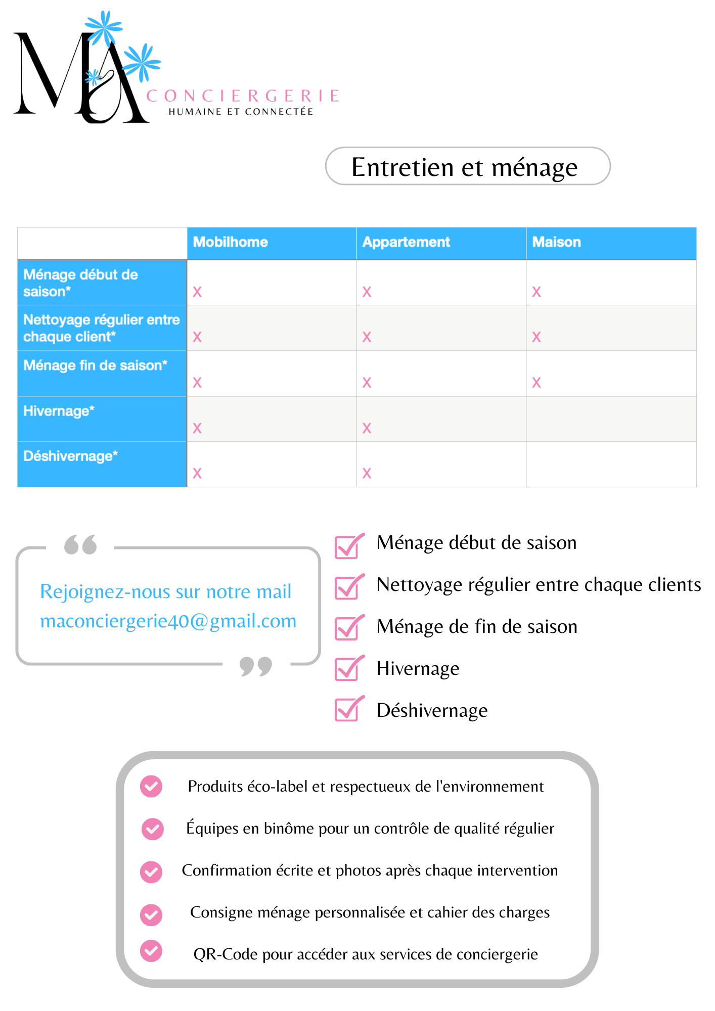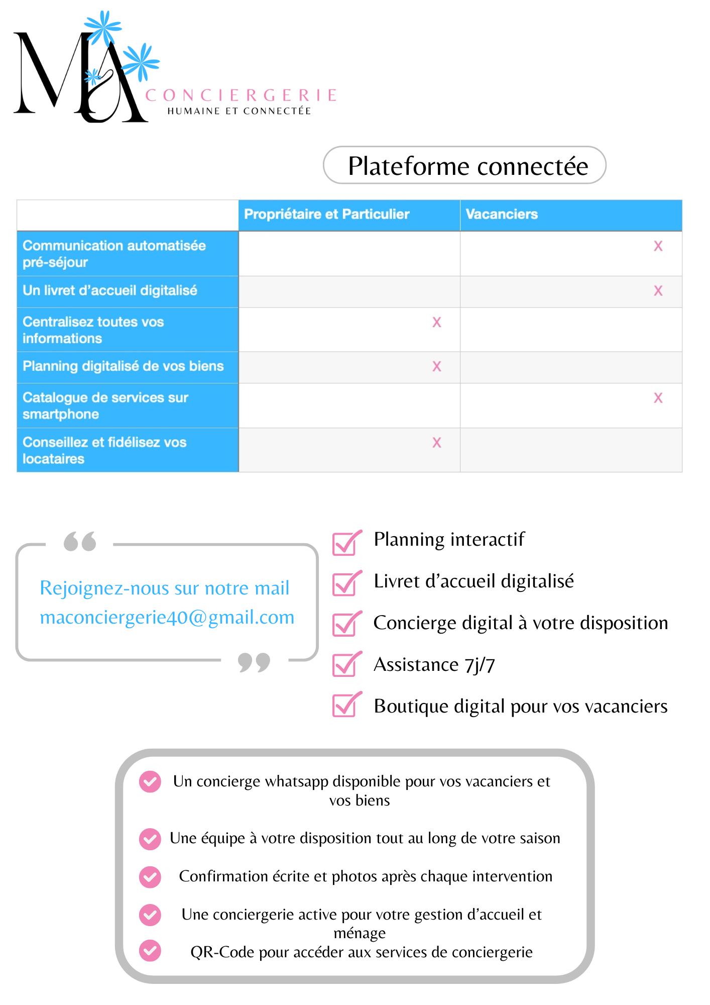 - Un concierge disponible 7j/7J pour vos vacanciers et vos biens